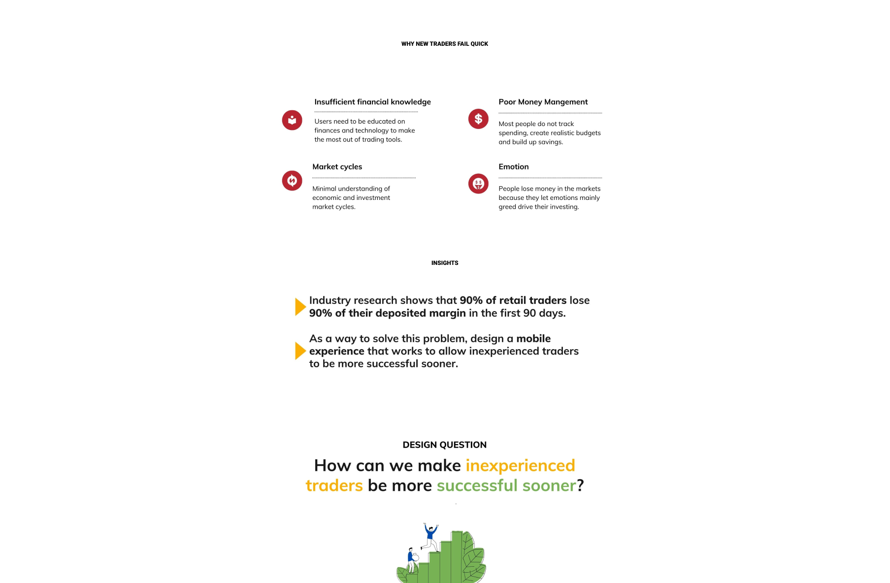 Industry research shows that 90% of retail traders lose 90% of their deposited margin in the first 90 days. As a way to solve this problem, design a mobile experience that works to allow inexperienced traders to be more successful sooner.